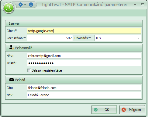 A példában láthatjuk a Google levélküldő rendszeréhez szükséges paramétereket. A felhasználóhoz szükséges megadni egy e-mail cím és jelszó párost, amivel a kliensprogram belép a levélküldő rendszerbe. Alatta a feladónál pedig bármilyen tetszőleges címet és nevet megadhatunk. A levélen ez fog megjelenni, például: nevalaszolj@valami.com
