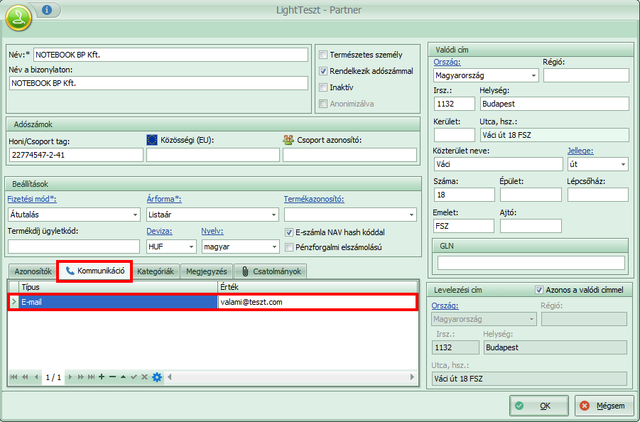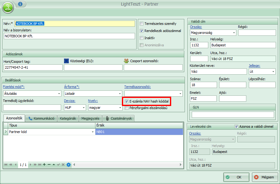 A partner törzsben az “E-számla NAV hash kóddal” kapcsolóval jelezzük, ha a partner így várja a számlát, valamint a partnernél ki kell tölteni a megadott kommunikációs e-mail címet.