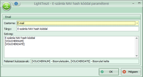 A Főmenü / Számlakészítés / Karbantartás / E-számla NAV hash kóddal paraméterei menüpontban kiválasztjuk az email kommunikációs csatornát, kitöltjük az email tárgy, és szöveg tartalmat. Ha nem adunk meg tartalmat, akkor a számlaszám kerül bele egyedül.