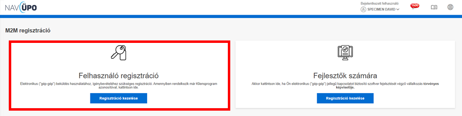 2. Jelentkezzünk be a https://ugyfelportal.nav.gov.hu/ oldalon és a képviselt cég kiválasztása után az oldal alján válassszuk az M2M regisztráció menüpontot: