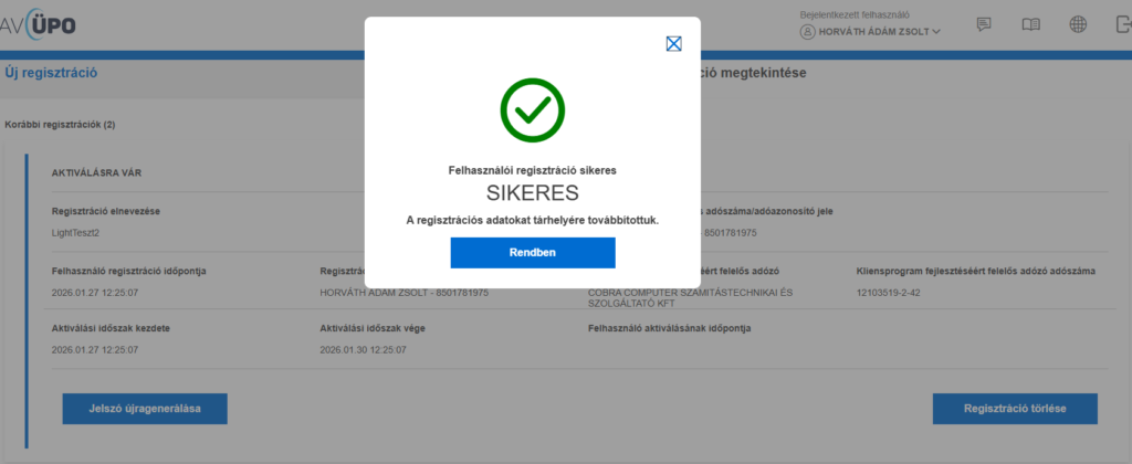5. Sikeres regisztrációról kapunk tájékoztatást: