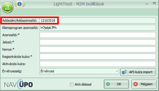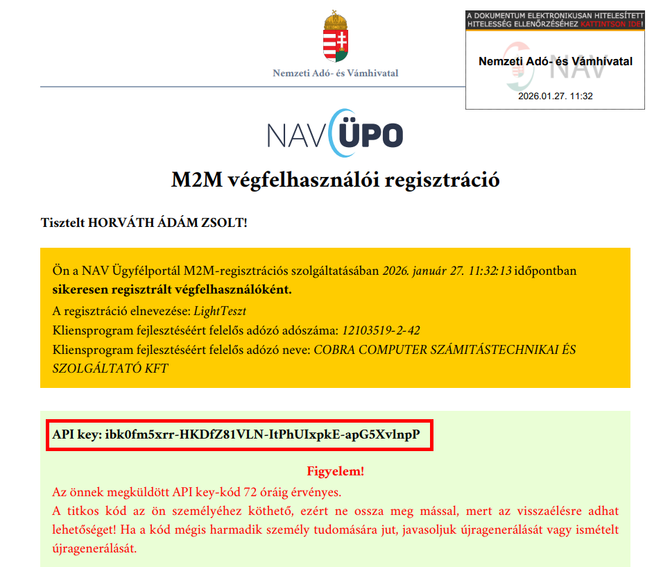 6. Ezután a tárhelyünkre kapunk üzenetet “Értesítés M2M nyugta érkezéséről” tárggyal. Ezt töltsük le és nyissuk meg. A benne található API key nélkülözhetetlen lesz a program kommunikációs paramétereinek beállításához, a PDF-et biztonságos helyre mentsük el! A kód 72 óráig használható a kiadástól számítva!