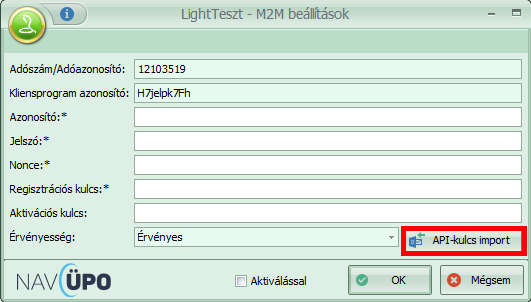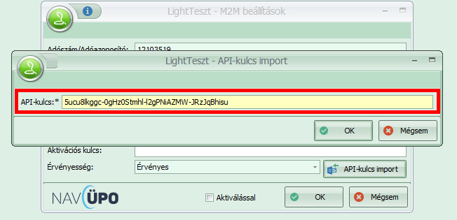9. Kattintsunk az [API-kulcs import] gombra és a megjelenő kis ablakon a mezőbe másoljuk be a tárhelyünkre kapott PDF-ből az API key-t. Majd okézzuk le ezt a  kis beviteli ablakot: