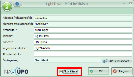 10. Visszatértünk ezzel a hitelesítő adatokat tartalmazó ablakra, ahol a program kitöltötte az első négy mezőt az API kulcs alapján. Aktiválni szükséges a felhasználót az első esetben, tehát az ablak megerősítése előtt helyezzük el az “Aktiválással” mezőben a pipát, majd nyomjuk meg az [OK] gombot:
