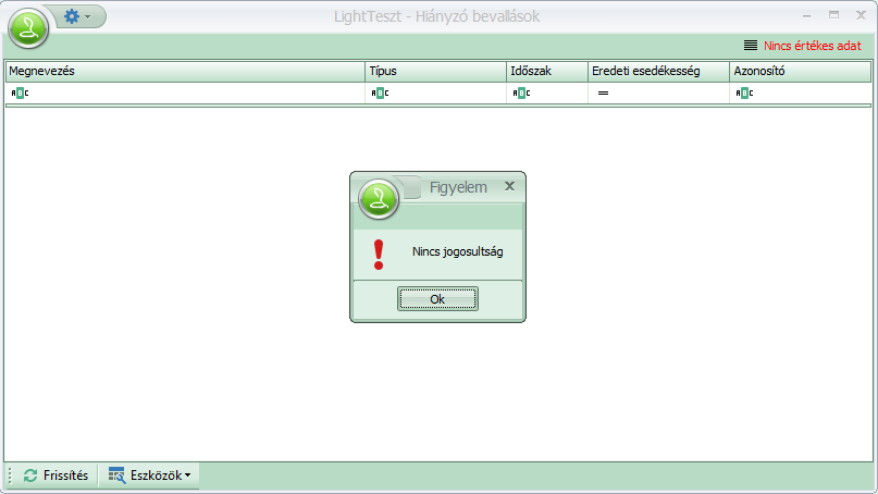 Amennyiben a lekérdezéseknél “Nincs jogosultság” figyelmeztetést kapunk, akkor a beállított felhasználó a beállított adószámhoz nem rendelkezik jogosultsággal, tehát nem képviseli a céget: